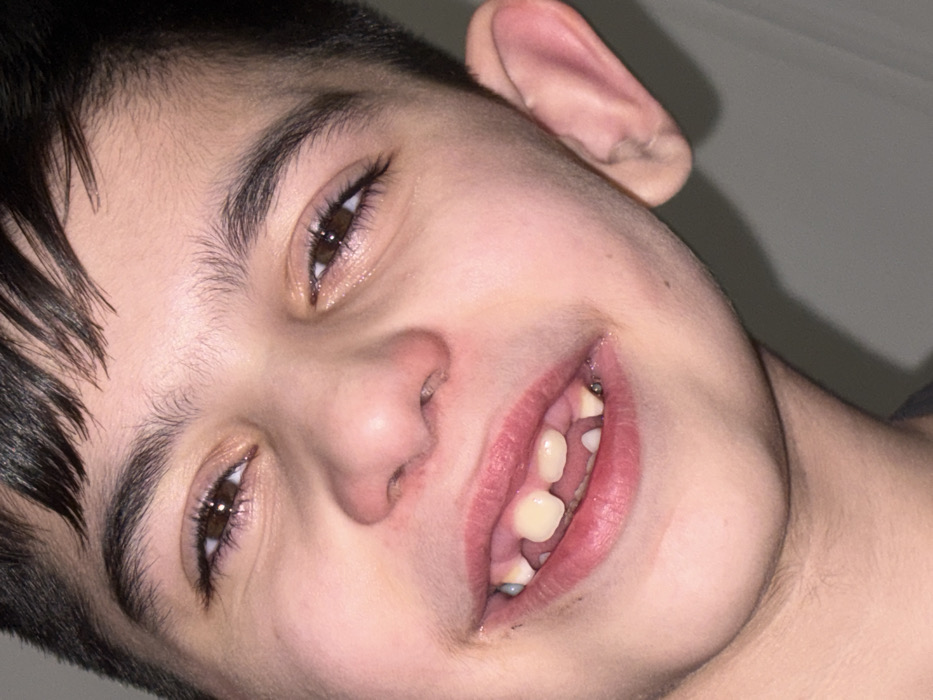 The image presents a close-up, angled portrait of a young male, likely a child or adolescent, purportedly located indoors in Saint-Étienne, France. The subject's face is illuminated, with the head tilted slightly upwards and towards the viewer's left. His dark brown eyes are open, reflecting light, and he possesses dark, defined eyebrows and eyelashes. The nose appears average in size with visible pores. The subject's mouth is open in a wide smile, revealing a set of teeth consistent with mixed dentition; two prominent, larger, and slightly yellowish central upper incisors are visible, flanked by smaller, whiter lateral teeth. Gaps are present between some teeth, and a small, dark, possibly metallic object or filling is discernible on a lower molar on the viewer's left. The lips are pink. Dark hair covers the forehead and the visible upper right side of the head. A portion of the right ear is visible, appearing normal. The skin tone is fair to medium. The background is a plain, uniformly light grey or off-white surface, devoid of any discernible objects or patterns.