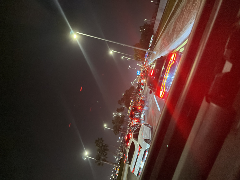 Nighttime traffic congestion unfolds on a multi-lane road lined with streetlights. A mix of vehicles, including a white car and a dark sedan with illuminated taillights, are visible. The view is from inside a car, focusing towards the traffic ahead. Palm trees dot the roadside, adding to the urban landscape under a dark sky.