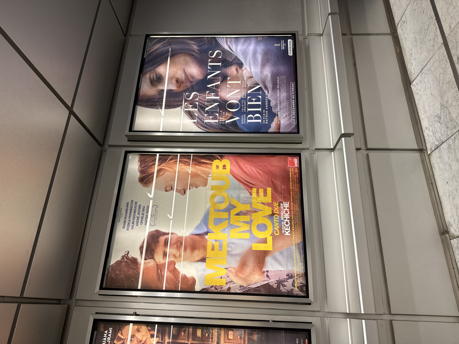 Two vertically stacked movie posters are visible. The top poster, in French, features a woman and baby, titled "LES ENFANTS VONT BIEN" starring Camille Cottin. The bottom poster, titled "MEKTOUB MY LOVE," in English and Italian, features actors Shain Boumedine, Jessica Pennington, and others. It's directed by Abdellatif Kechiche. Part of a third poster is barely visible at the bottom. The posters are displayed in black frames, against a wall with white paneling.