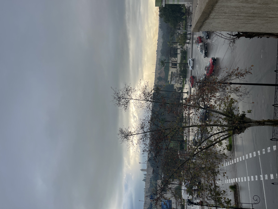 The image presents an elevated, wide-angle view of an urban landscape in Fez, Morocco, on an overcast day with wet ground surfaces. The foreground features the top edge of a concrete structure on the right, and a dark, ornate metal railing spanning the bottom. A large deciduous tree, mostly bare with some dark, sparse leaves, occupies the center foreground. The midground reveals a wet asphalt road, likely an intersection, marked with white crosswalk stripes. Multiple vehicles are present on the road, including several red cars, a white utility van, and various dark-colored automobiles, indicating active traffic. To the right of the central tree, a distinctive round building with a light-colored facade and a green conical roof is visible, surrounded by trees, including palm trees, and green parkland. In the background, a dense urban area with buildings extends across rolling hills. A tall, square minaret with a green-tiled cap, identifiable as a prominent landmark like the Bab Bou Jeloud minaret, stands out on the horizon, slightly to the left of center. The sky is predominantly covered with heavy, grey clouds, but a bright strip of diffused sunlight is visible along the horizon, breaking through the cloud cover. The overall scene depicts a typical street environment in the Ville Nouvelle (New City) of Fez, looking towards the historical medina, characterized by cool, damp conditions.