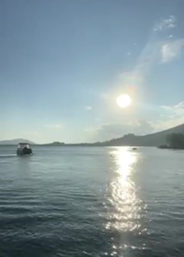 The video depicts a calm, sunlit seascape with a boat moving away from the viewer across the water