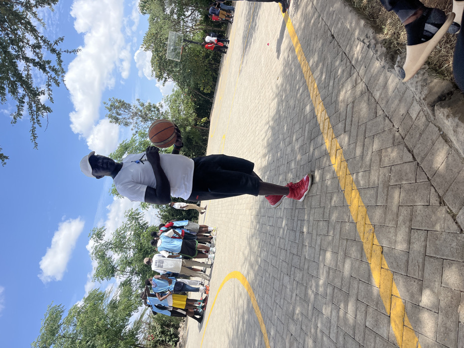 A man in a white shirt, black shorts, red sneakers, and a white hat holds a basketball on an outdoor court. A yellow line marks a section of the court. In the background, a group of people stand near the curve of the court. The sky is blue with scattered clouds, and trees surround the court. A basketball hoop is visible in the distance.