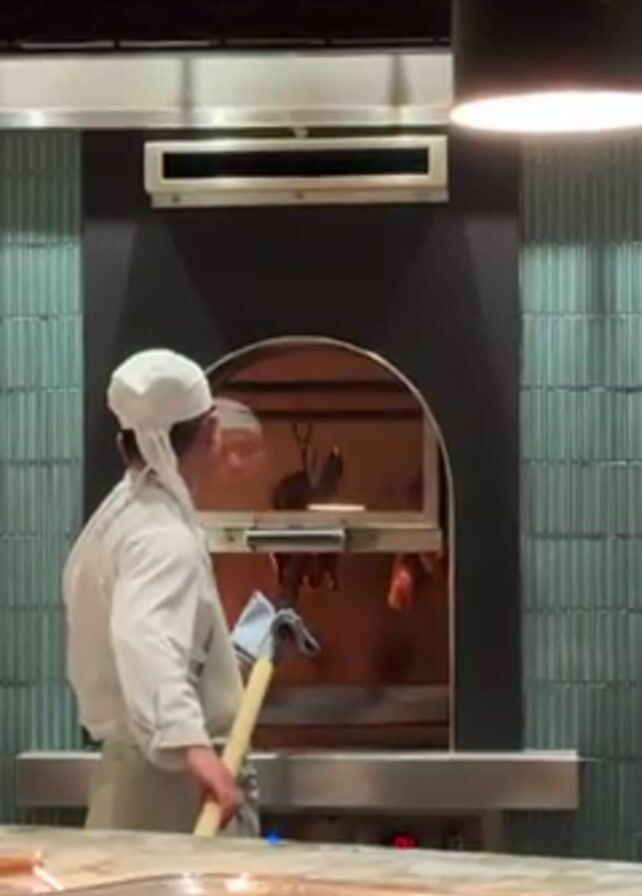 A chef in a white uniform and hat stands in front of a large, industrial-looking oven. The oven is black with a large, arched window that reveals several pieces of meat hanging inside. The chef is holding a long-handled tool with a gray cloth at the end. He uses the tool to adjust something inside the oven. The area around the oven is tiled with blue-green tiles. Above the chef is a black, industrial-style light fixture. In the foreground, there is a counter with food preparation items on it. The chef seems to be monitoring the cooking process of the meat inside the oven.