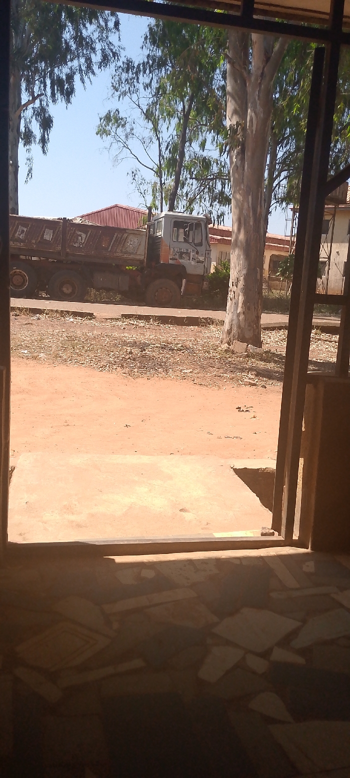 The scene is viewed from an interior, looking out through a dark rectangular frame. The interior floor, visible at the bottom, is dark with irregular light-colored tile fragments. Outside, a reddish-brown dirt ground with sparse dry vegetation occupies the foreground. A concrete curb or low barrier runs horizontally across the mid-ground. Parked on the dirt beyond the curb is a large, weathered, light grey dump truck with a rusty brown dump bed, facing slightly right. Its cabin shows signs of wear and faded graphics. To the right of the truck, a tall tree with light-colored, peeling bark stands prominently, extending towards the clear blue sky. Additional trees with green, stringy foliage are visible on the left and behind the truck. In the background, buildings with reddish-orange corrugated roofs are partially visible behind the trees and the truck. The sky is bright blue and cloudless, indicating daytime. No individuals or active subjects are present in the image. The location is in the city of Duk, Nigeria.