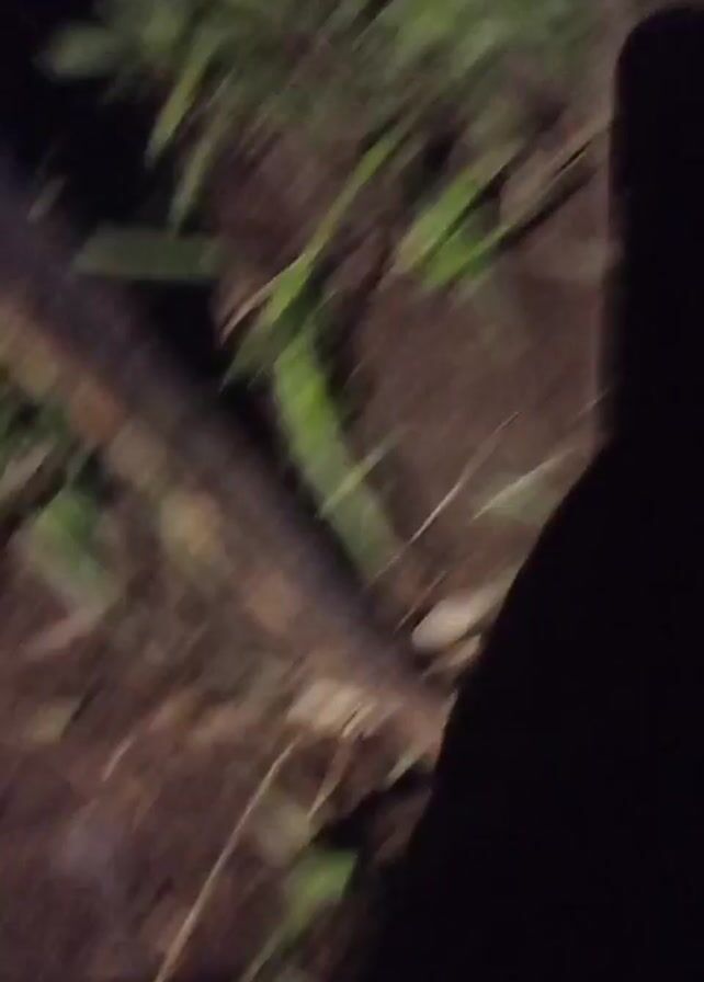 close-up view of the ground at night. There is dirt, grass, and roots visible. In the middle of the video, a toad becomes visible, sitting on a root. The focus is initially blurry. Red shoes are visible in the bottom of the frame at the beginning.