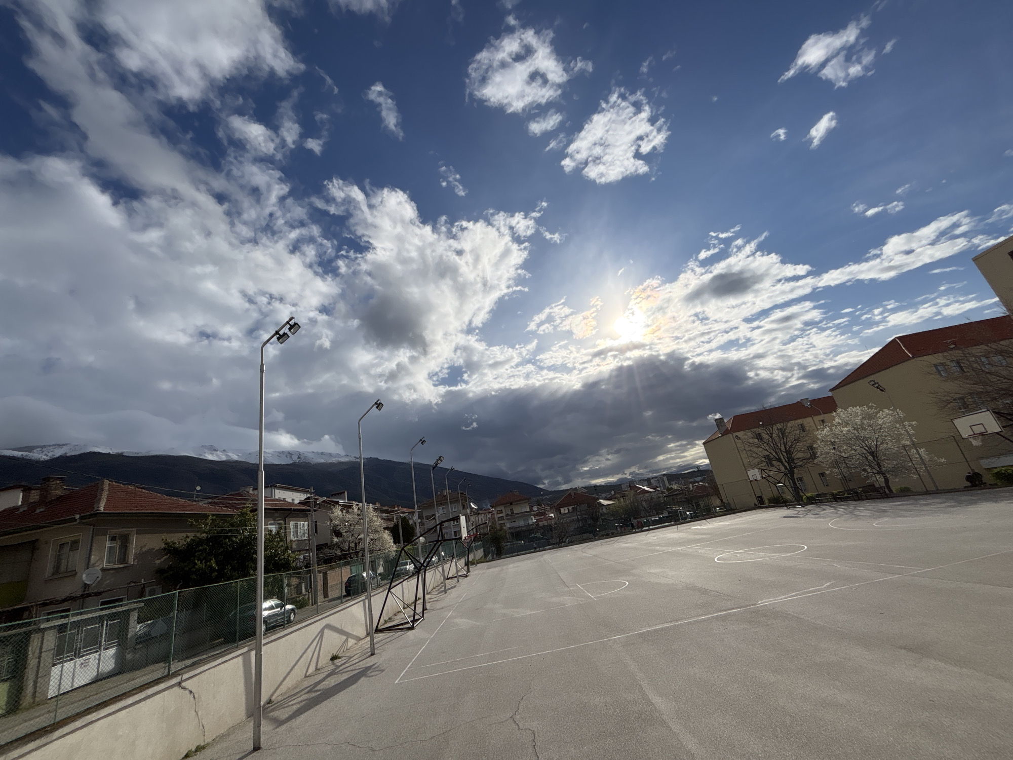 The image depicts an outdoor basketball court in Karlovo, Bulgaria. The court is paved and marked with white lines. Several basketball hoops are visible. Buildings with red-tiled roofs are present in the background. In the distance, there are mountains with snow-covered peaks. The sky is cloudy with patches of blue. Street lights stand around the edge of the basketball court. The sun shines brightly through the clouds. A fence separates the basketball court from a row of houses and parked cars.