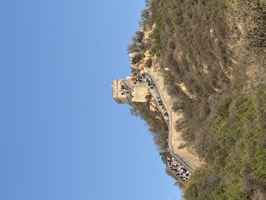 This image displays a segment of the Great Wall of China, located within Yanqing District. The wall, constructed from light-colored stone, features a fortified pathway with crenellated parapets, steeply ascending a natural incline. A prominent, multi-story stone watchtower with battlements is situated at the highest visible point of the wall, cresting the hill. Numerous individuals, appearing as small figures, are distributed along the wall's pathway, particularly concentrated on the ascent towards and around the watchtower, indicating pedestrian activity and heavy foot traffic. The surrounding terrain consists of a rugged hillside, densely covered with a mix of evergreen trees and bare deciduous vegetation. The sky above is clear and light blue, suggesting fair weather conditions.