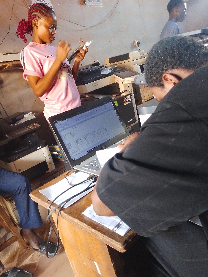 An indoor commercial setting, possibly a print shop or cybercafe, features three individuals