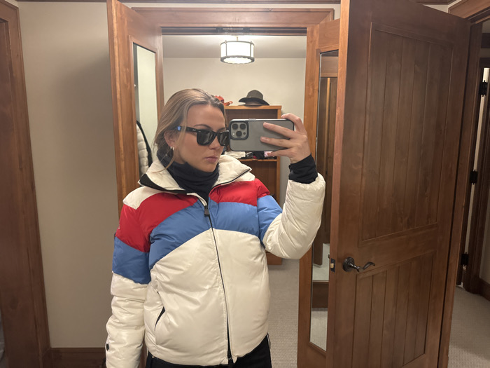 A woman poses for a mirror selfie indoors. She wears a white, red, and blue puffy jacket over a black turtleneck, along with sunglasses. The setting appears to be a hallway or closet area with dark wood doors and trim. A light fixture and a hat are visible on a shelf in the background. The woman is holding a smartphone up to take the picture.