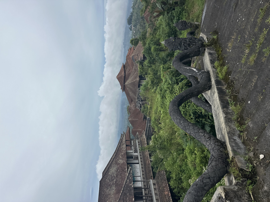 The image depicts an abandoned architectural complex located on a hillside in Mekarsari, Indonesia, under an overcast sky. In the foreground, weathered, dark grey stone steps descend towards the viewer, flanked on the right by a dark, serpentine-shaped stone railing. This railing is textured to resemble scales, exhibits white discoloration, and terminates in a stylized dragon head, with a second, smaller head further down. Small patches of green moss and grass are visible on the steps and railing base. The midground features multiple multi-story buildings with traditional red-tiled roofs, appearing aged and in disrepair. The most prominent structure on the left has open balconies and unglazed window frames, with light-colored walls showing signs of weathering. Another building to the right features a large, conical roof. All structures are heavily encroached upon by dense, wild green vegetation, including trees, bushes, and vines, suggesting a prolonged state of neglect. The background reveals a hilly landscape partially obscured by a thick band of low-lying white clouds or fog, with a pale grey, cloudy sky above. No individuals or active subjects are present in the scene.