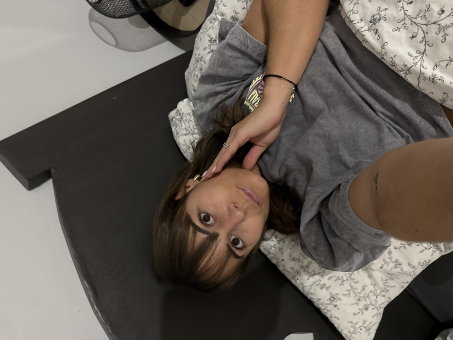 A woman lies on her side in bed. She wears a grey t-shirt and her hair is shoulder length with bangs. She has a gold hoop earring in her left ear, a ring on her left hand, and bracelets on her left wrist. She looks directly at the camera with a curious expression. The bedding has a floral print. A black surface is next to the bed. A partial view of a fan is in the background. A small tattoo is visible on the woman's right arm.