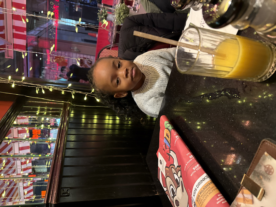 A young child with dark skin and dark, curly hair, wearing a light grey knitted sweater and a small gold earring, sits facing forward with a neutral expression at a dark, reflective table inside a restaurant
