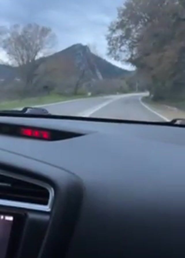 car driving on a road towards a mountain under a cloudy sky. The road is paved and has white lines marking the edges. There are trees on either side of the road, some without leaves. The mountain is visible in the distance, partially obscured by clouds. The dashboard of the car is visible in the foreground. There is a red light on the dashboard and a touchscreen in the center console. Loud music is playing.