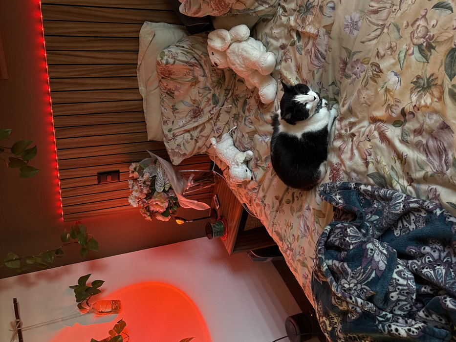 This image depicts an indoor bedroom scene in the city of Santa Clara Ocoyucan, Mexico. The environment is illuminated by ambient red light, originating from an LED strip along the top of a vertically slatted wooden headboard and a prominent circular red light projected onto the left wall. Green leafy vines are suspended from above and from a clear glass bottle hanging on the left wall. The central focus is a bed covered with floral-patterned bedding in tones of beige, pink, and green. A black and white domestic cat, with a white face and chest, is curled up and resting on the bed, wearing a collar with a bell. Adjacent to the cat, closer to the headboard, are two white fluffy stuffed animals: a smaller one resembling a lamb or poodle, and a larger one resembling a teddy bear seated upright. A crumpled teal and purple paisley-patterned blanket rests on the lower left section of the bed. To the left of the bed, a wooden nightstand supports a small table lamp, a dark jar candle positioned on a red coaster, a remote control, and a bouquet of artificial flowers (pinks, whites, greens, blues) arranged in a clear glass vase and wrapped in white tissue paper. An electrical outlet is visible on the wooden headboard. No people are present in the scene.