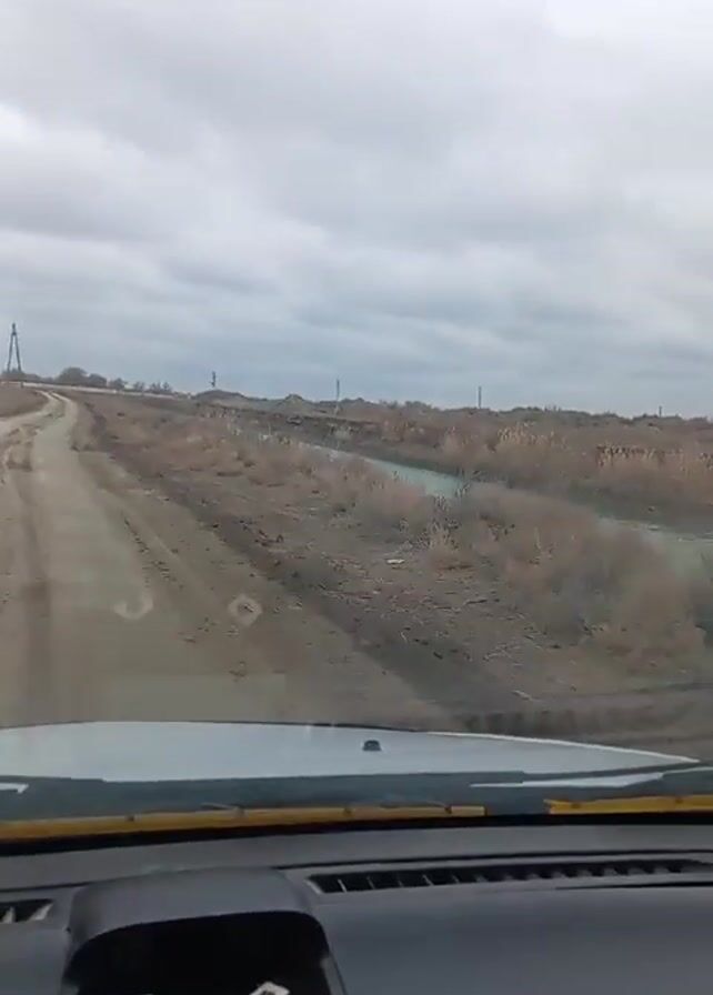 view from inside a car driving down a dirt road. The road is muddy and rutted, with dry grass and vegetation on either side. The sky is overcast with grey clouds. On the dashboard of the car are a pair of sunglasses and a magnetic bracket. The music is playing in the background. The car continues down the dirt road.