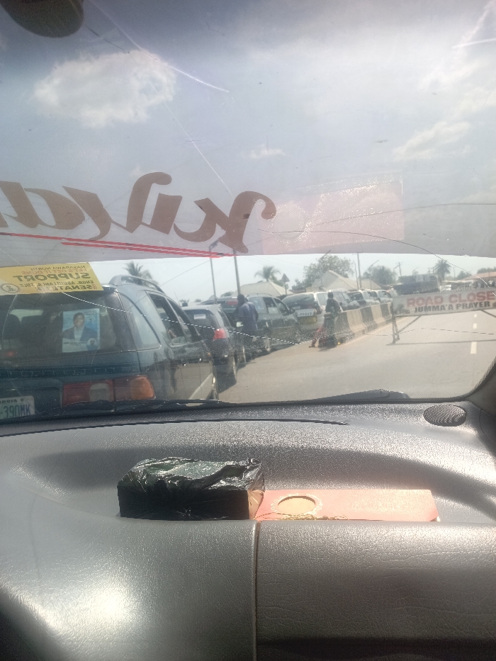 The image depicts a road scene in Garaku, Nasarawa State, Nigeria, viewed from inside a vehicle looking forward through the windshield. The vehicle's gray dashboard occupies the lower portion of the frame, holding a dark, rectangular object wrapped in a black plastic bag on the left, and a reddish-orange rectangular item with a central gold circular embellishment on the right. The windshield, which has several fine cracks and reflections, features a partially visible, stylized banner affixed to its upper interior. Beyond the windshield, a line of multiple vehicles is stationary on a paved road under a partly cloudy sky. The vehicle directly ahead is a dark-colored sedan displaying a partially reversed, yellow-bordered political campaign poster on its rear window. The poster shows a man's portrait and contains the text "SUPPORT" and "SENATE" along with what appears to be "CHIMA". The vehicle's license plate is visible as "NIGERIA FCT - 390MK". To the right side of the road, a barrier system composed of concrete blocks restricts traffic flow. A white sign attached to the barriers explicitly states "ROAD CLOSED JUMMA'A PRAYER", indicating the reason for the stoppage. Several individuals are visible on foot, standing and walking along the roadside between the vehicles and near the barriers. In the background, various trees, including palm trees, and distant structures are discernible. The scene suggests a temporary road closure related to Friday congregational prayers.
