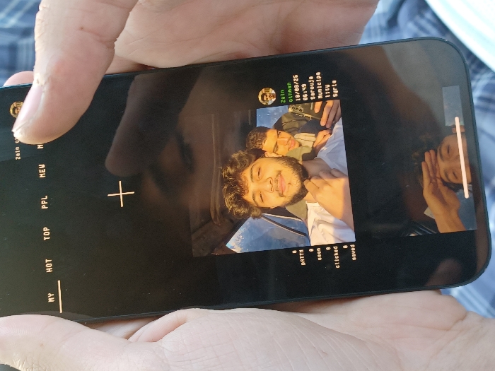 A person's hands hold a black smartphone displaying a social media interface. The phone screen shows navigation tabs "MY", "HOT", "TOP", "PPL", "MEM" at the top, with "MY" underlined. A user profile for "Zain Othman" is visible in the top right. The main content on the screen is a photo featuring two young men in what appears to be a vehicle interior. The man in the foreground, with dark curly hair and a beard, wears a white t-shirt and touches his chin with his right hand, looking towards the camera with a slight smile. Behind him, partially visible on the right, another man looks towards the camera while holding a smartphone. Overlaid text on the image provides details: * On the left: "PRTH", "seen", "clicked", "saved" with numerical values. * On the right: "Zain Othman", "18/08/25", "06:49", "Sarouja", "Municipality", "city", "Syria". Below the main image on the screen, a blurred reflection or smaller image shows a portion of a face and a hand. The background behind the phone is an out-of-focus patterned fabric, likely blue and white.