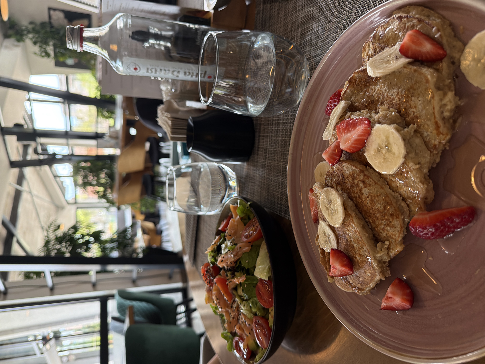The image depicts a table setting in an indoor dining area, likely a restaurant or cafe. The table is set with a glass water bottle, two drinking glasses, a small container (possibly for condiments), and a salad in a black bowl. A pink plate holds what appears to be a stack of pancakes adorned with sliced strawberries and bananas, drizzled with syrup. The foreground reveals a view through a window, showcasing outdoor foliage and possibly urban structures. The location is speculated to be in Montana, Bulgaria, based on contextual information. The overall scene suggests a meal setting, possibly brunch or a light meal, in a well-lit environment.