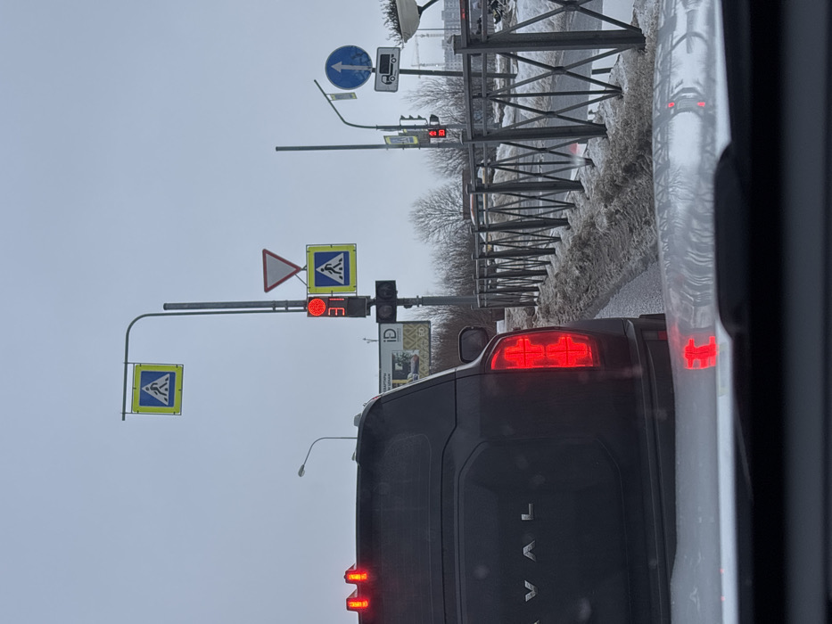 The image depicts a street scene in Zanevka, Russia, on an overcast day with wintry conditions. The perspective is from inside a vehicle, looking forward over its dashboard towards a dark-colored SUV immediately ahead. The SUV, identified by "HAVAL" lettering on its tailgate, has its red brake lights illuminated, reflecting on the viewer's vehicle dashboard. To the right of the SUV, a grey metal pole supports multiple road signs and traffic lights. A primary traffic light displays a solid red circle with a digital countdown showing "31" seconds. Below this traffic light is a square blue sign with a white pedestrian symbol, indicating a pedestrian crossing. Above the traffic light is an inverted white triangle with a red border, signifying a "Give Way" or "Yield" instruction. Higher on the pole, another square blue sign with a white pedestrian symbol is visible. To the right of the road, a black metal pedestrian barrier with X-shaped segments separates the roadway from a snow-covered median or sidewalk. Dirty snow and slush accumulate along the curb. Further down the street, another traffic light is also red. A blue circular sign with a white upward arrow (indicating "Go Straight") is mounted on a pole, with a smaller blue sign depicting a white truck below it. In the background, bare trees line the road, and a billboard displaying "КВАРТИРЫ" (Apartments) and "ID" is partially visible. Construction cranes are faintly visible on the horizon. No people are discernible in the scene.