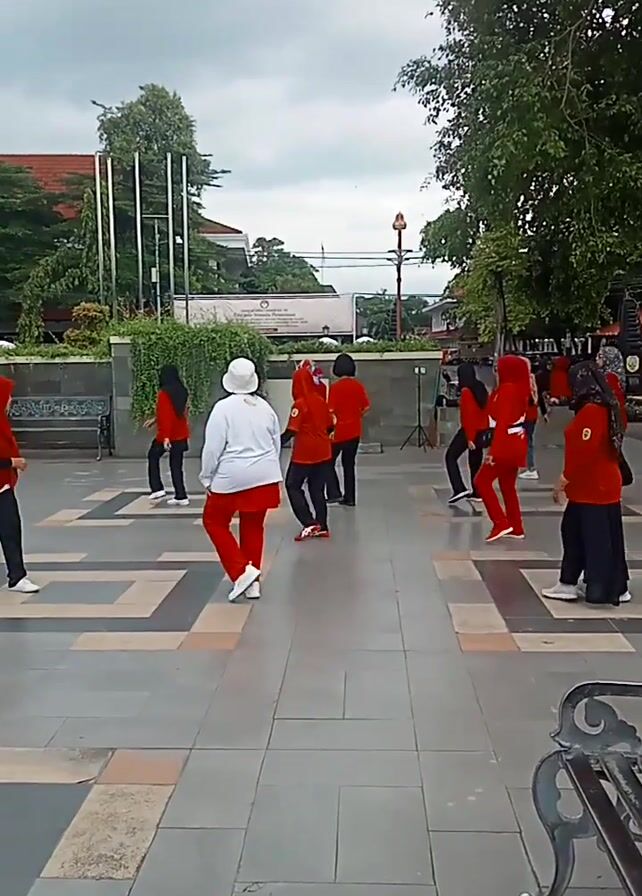 A group of people, mostly wearing red pants and shirts, are walking in a row on a paved walkway. Some of the individuals are wearing hijabs. The walkway is gray and white with a geometric pattern. There are trees to the left of the frame and buildings in the background. The sky is overcast.