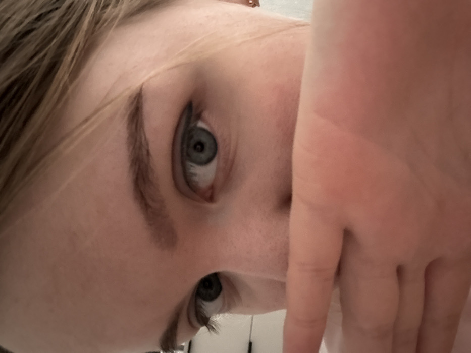 The scene depicts a close-up, chest-up view of an individual in an indoor setting within the city of Nizhnekamsk, Russia. The subject presents with fair skin, blue-grey eyes with dark pupils, and light brown eyebrows. Black eyeliner is visible on the upper lash line of the subject's right eye. Light-colored hair, appearing blonde or light brown, is visible around the forehead and right temple. The lower half of the subject's face, encompassing the nose and mouth regions, is obscured by a pale-skinned right hand positioned horizontally across the face. A small, metallic earring is visible on the subject's right earlobe. The background is uniformly light-colored and out of focus, providing no specific environmental details beyond an indoor context. The subject is looking directly towards the viewer.
