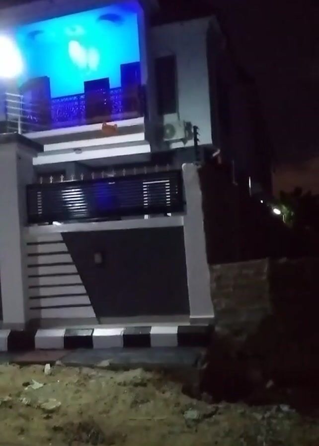front of a modern two-story house at night. The house has a balcony with ornate railings and is illuminated with blue lighting. The fence surrounding the property is constructed with white pillars, grey panels with geometric designs, and black horizontal bars. The base of the fence is painted with alternating black and white squares. A bright light source is positioned above the house. The ground in front of the house appears to be unpaved and consists of dirt and debris. The camera moves slightly, showing more of the fence and the surrounding area, which is dark and indistinct.