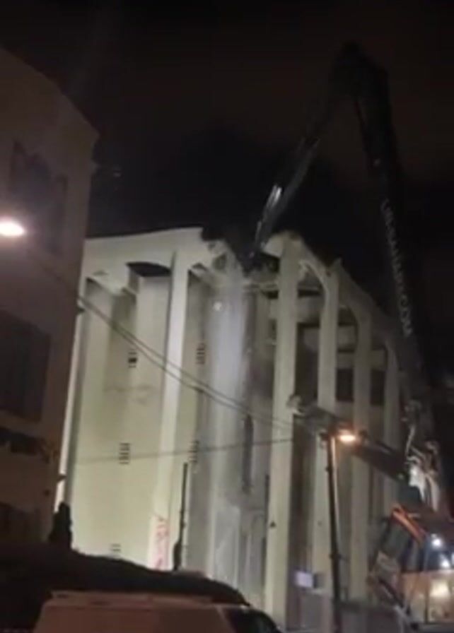 A large crane-like vehicle is tearing down a partially-demolished building at night. The building is white with several tall, supporting columns. The crane is dark with visible branding that reads "LIFTSAHARICO.COM" along its arm. Water is spraying from the point where the crane's demolition tool is impacting the building. A white pickup truck is parked on the street in front of the building, along with other vehicles. There are streetlights illuminating the scene. The sky is dark and cloudy.
