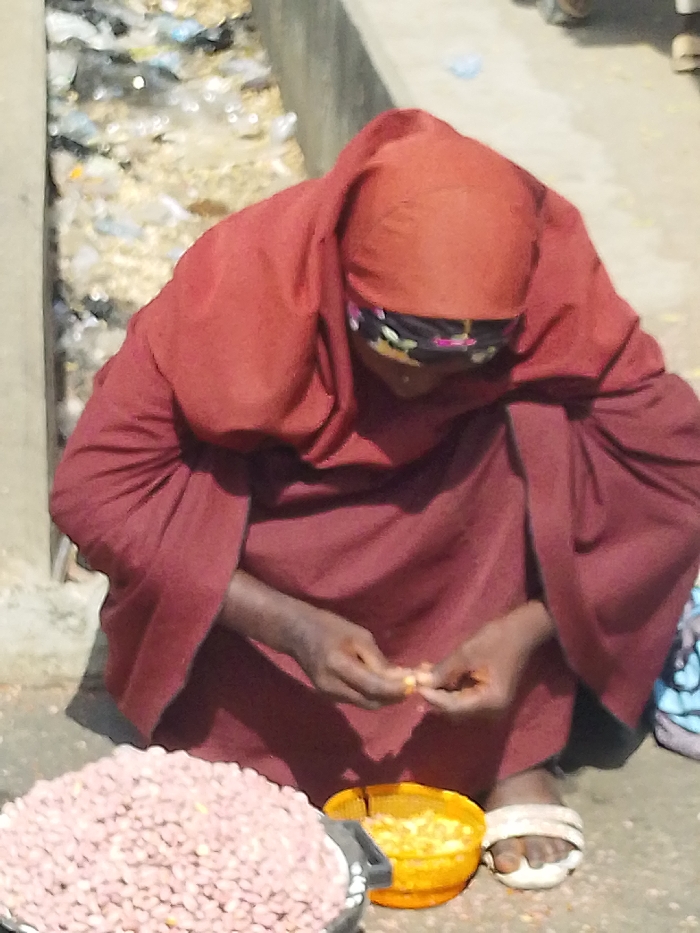A person is depicted crouching on the ground in an outdoor setting in Tarauni, Nigeria. The individual wears a reddish-brown full-length garment and a black head covering with a floral pattern, which partially obscures the face. Their hands are engaged in an activity, appearing to shell or sort small, light-colored objects. In the immediate foreground, to the left, a dark-colored container holds a large quantity of reddish-brown, oval-shaped items, consistent with raw groundnuts or peanuts. To the right of this container and near the person's right foot, an orange plastic bowl contains a pile of smaller, yellow or light-colored kernels, likely shelled peanuts or corn. The person is wearing light-colored, open-toed sandals. The ground surface is a light grey, possibly concrete or asphalt. To the left and in the background, a narrow, open drainage ditch or gutter is visible, filled with an accumulation of refuse, including plastic bottles, wrappers, and miscellaneous debris, suggesting an urban or semi-urban environment.