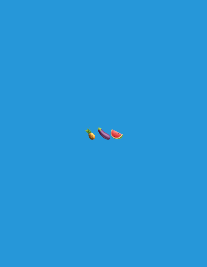 The scene, situated in Netanya, Israel, consists of a flat, solid blue background. Three distinct digital emoji graphics are positioned horizontally in the lower-middle portion of the frame. From left to right, these objects are a yellow-brown pineapple, a deep purple eggplant, and a red and green watermelon slice displaying its cross-section. No people, discernible actions, or physical interactions are depicted between the objects. The environment is a two-dimensional, digitally rendered field, devoid of any specific geographic features or real-world depth.