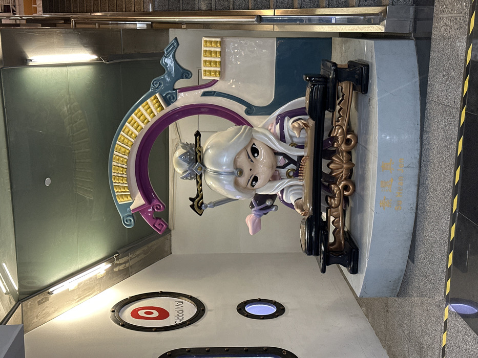 A cartoonish statue of a character with white hair and an ornate headdress is displayed in a subway station