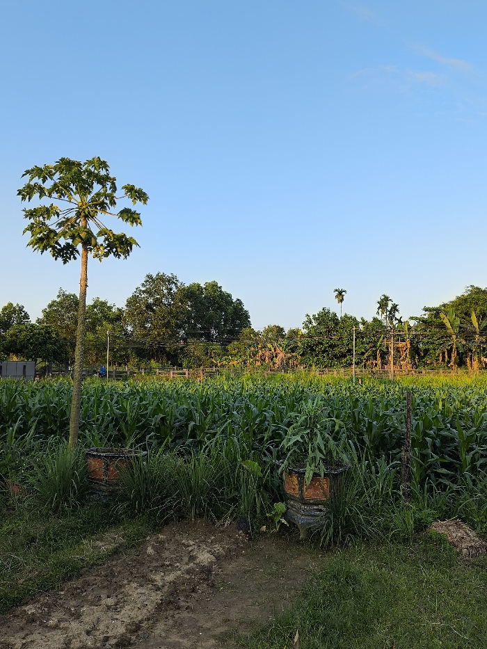 The image depicts an agricultural scene in Thành phố Quảng Ngãi, Vietnam, under a clear, light blue sky. In the foreground, a narrow, unpaved dirt path with scattered green grass leads into the frame. To the left of the path, a single papaya tree stands tall, its slender trunk supporting a crown of green leaves and visible fruit. Adjacent to the papaya tree, two decorative, octagonal planters, appearing to be made of concrete or stone with reddish-brown and black patterns, are partially obscured by tall green grasses and other plants, one containing a leafy green plant. A thin wooden stake is visible near the rightmost planter. The midground is dominated by a dense field of tall green crops, primarily consistent with young corn plants, extending horizontally across the frame. Beyond this crop field, a low, light-colored fence or retaining wall is discernible. In the distance, to the left, a solitary individual dressed in blue is faintly visible walking amidst the vegetation or along the fence line. The background features a thick line of diverse trees, including broadleaf trees, slender palm-like trees, and what appear to be banana trees with their characteristic broad leaves and clusters. Utility poles with overhead lines are interspersed among the background trees. The lighting suggests late afternoon, with soft, directional sunlight illuminating the scene from the right. No specific actions or interactions are clearly discernible apart from the distant person.