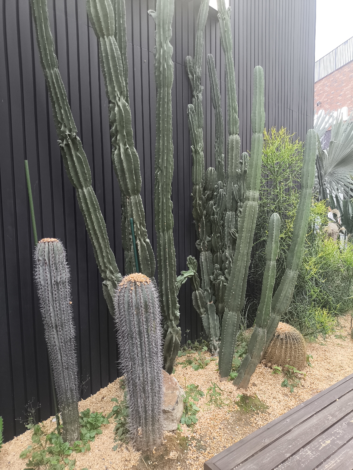 cactus garden in Futian District, China. Several tall, columnar cacti of varying shades of green stand against a dark, vertically-paneled wall. Two smaller, grayish-blue cacti with dense spines are situated in the foreground. The ground is covered with light brown pebbles, interspersed with small green plants. In the background, there are other green plants, including a palm-like fan. A partial view of a wooden bench is visible in the bottom right corner. A building is partially visible in the background.