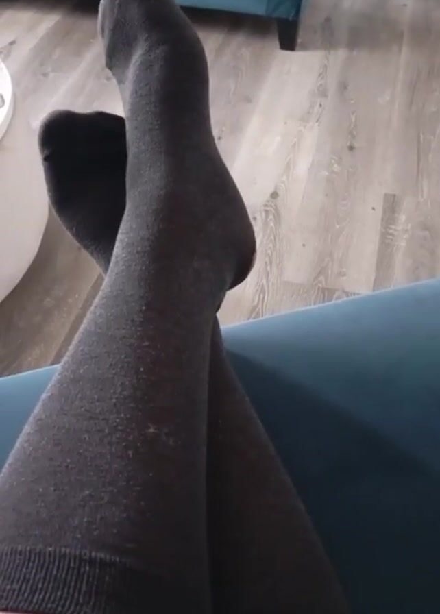 A person's legs, covered in dark gray, knee-high socks, are crossed on a blue couch
