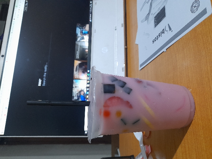 The scene depicts an indoor environment, likely a desk area, located within Surabaya, Indonesia. A clear plastic cup, containing a pink, milky beverage with assorted solid inclusions (red fruit slices, dark cuboid jellies, yellow strips, and small orange spheres), stands on a light-brown wooden surface. A black plastic straw protrudes vertically from the clear plastic lid of the cup. Condensation is present on the exterior surface of the cup. In the background, a large computer monitor with a dark screen displays the text "Search the reality..." and several smaller content thumbnails below. To the immediate right of the cup, a white document or pamphlet featuring the partial text "bistas" and an illustration of cutlery is visible. A small white plastic utensil and part of a wrapper are partially visible to the left of the cup. No individuals are present in the image.