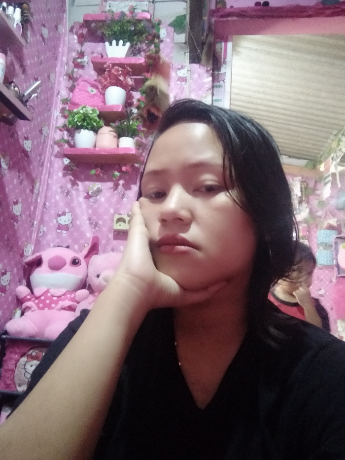 A person with short black hair rests their head on their hand, gazing directly forward with a solemn expression. The backdrop features a bright pink room adorned with Hello Kitty-themed wallpaper, plush toys, and tiered shelves showcasing various potted plants. A second person is partially visible in the background, adding depth to the scene. The overall aesthetic is playful and feminine, contrasting with the individual's serious demeanor.