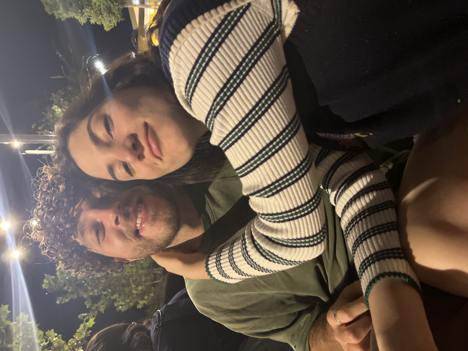An outdoor night scene in Modiin-Maccabim-Reut, Israel, captures two individuals in the foreground. A male subject with dark curly hair and a beard, wearing an olive green shirt and a silver ring on his left ring finger, smiles towards the camera. A female subject with dark straight hair, wearing a white ribbed long-sleeved shirt with horizontal dark blue and green stripes over a dark blue garment, exhibits a slight pout or smirk. Her right arm is draped around the male's neck, with her hand resting on his upper chest. The background features out-of-focus artificial lights, including string lights and pole lights, along with trees and indistinct illuminated structures.