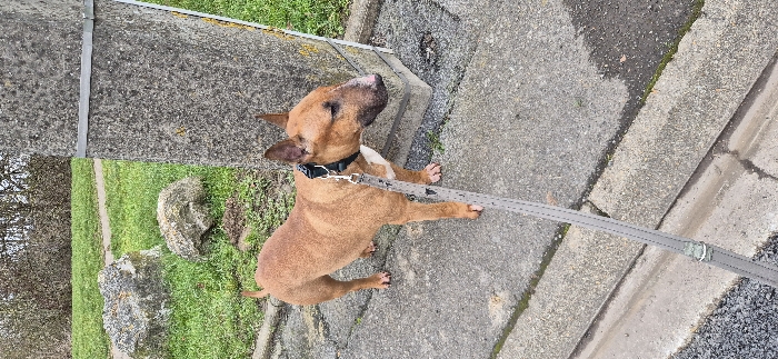 - "A reddish-brown Bull Terrier dog stands on a gray concrete sidewalk, positioned next to a rectangular gray concrete pillar" by FM-Grq9g2, licensed under CC BY 4.0