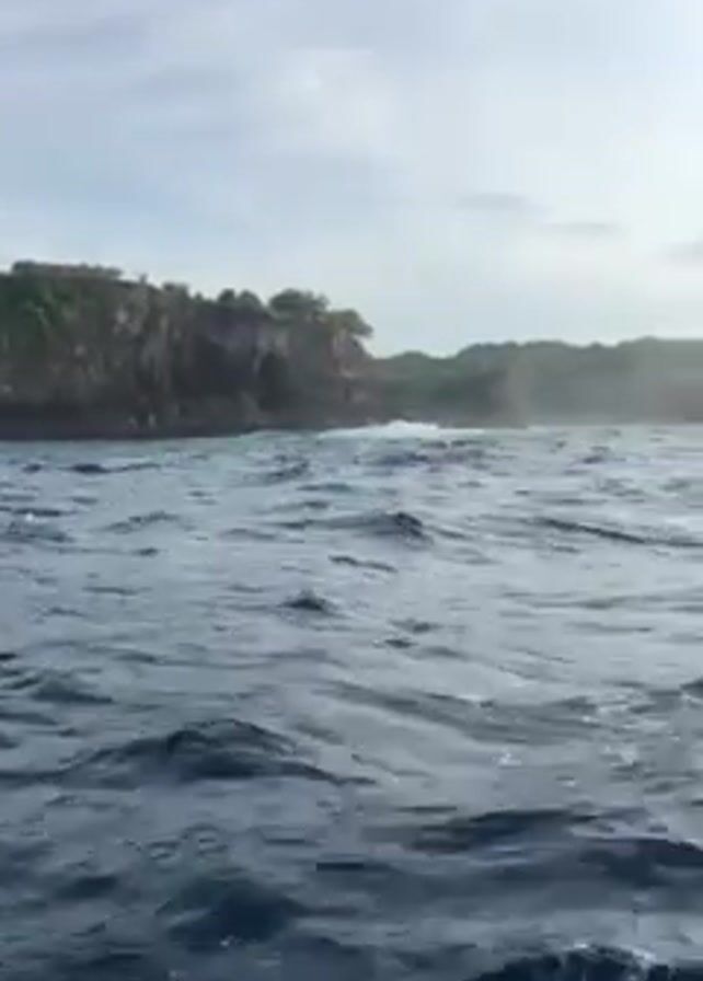 view from a boat moving through a body of water, likely the ocean. The water is a dark blue color and choppy with small waves. In the distance, there is a rocky coastline with green vegetation on top. The sky is overcast with a mix of white clouds and a pale blue hue. The sun is partially obscured by the clouds, creating a hazy glow on the horizon. The camera appears to be mounted on the boat, capturing the movement of the water as the vessel progresses.