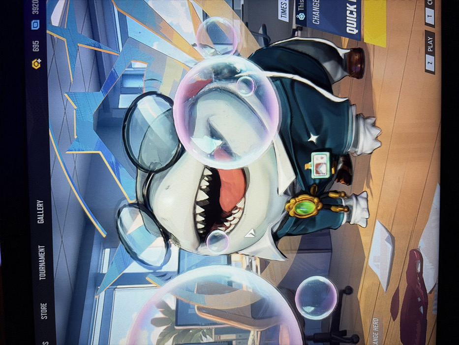 The image displays a video game interface on a screen. On the left side, vertical options include "STORE," "TOURNAMENT," and "GALLERY." At the top left, currency values are shown: "695" and "3920." The right side features buttons for "Z PLAY" and "TC," and "QUICK" with other faded text. The main focus is a cartoon shark character wearing glasses and a suit, surrounded by bubbles, in a game's promotional or character selection screen.
