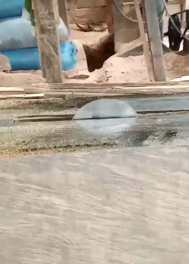 stationary shot of a circular saw blade protruding slightly from a wooden table. The saw is not cutting anything. The table is covered in sawdust and wood debris. In the background, there are stacked blue sacks and a makeshift structure of wooden beams and boards, obscuring a dark, possibly excavated area. An engine is partially visible. The scene appears to be a woodworking or lumber operation.