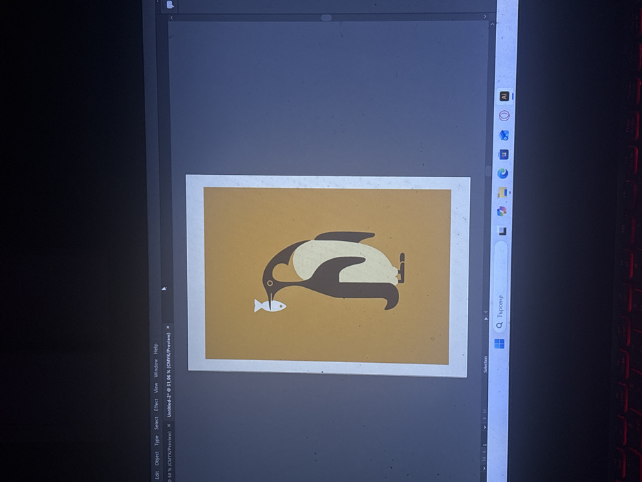 The scene captures a computer monitor displaying a graphic design application interface, likely Adobe Photoshop, situated in Stara Zagora, Bulgaria. The monitor presents an active digital document titled "Untitled-2*" at a zoom level of 51.06%. The central content is a vertical, stylized illustration of a penguin rendered in dark brown and light beige tones. The penguin stands upright, facing left, and holds a white, simplified fish horizontally in its beak. This illustration is set against a solid, muted orange-brown background, framed by a thin white border. The computer's operating system taskbar is visible at the bottom of the screen, featuring a search bar with the Bulgarian text "Търсене" and pinned application icons, including one for Adobe Illustrator. The immediate foreground reveals a portion of a dark keyboard with active red backlighting. No individuals are present in the image.
