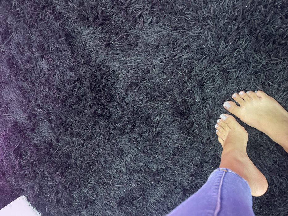 - "An overhead view captures a person's lower left leg, clad in purple-blue denim jeans, partially visible in the upper left quadrant, along with two bare feet positioned on a dark gray or black shag carpet" by FM-ssaJ42, licensed under CC BY 4.0
