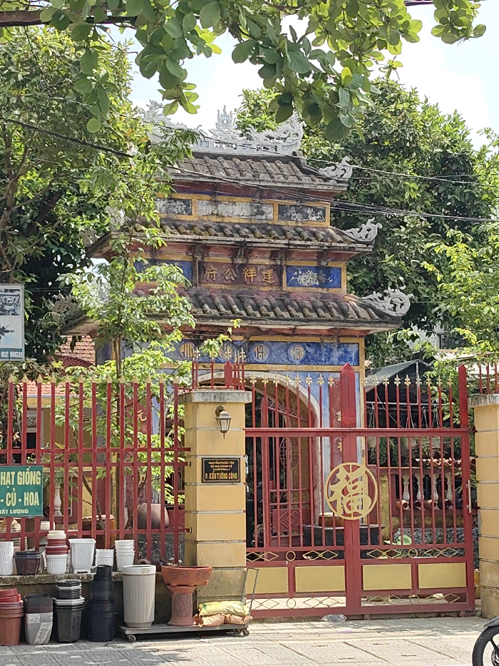 A multi-tiered traditional Vietnamese architectural structure, likely a gate or ceremonial entrance, is depicted in Vỹ Dạ Ward, Vietnam. The structure features a dark tiled roof with ornate white decorative elements resembling dragons and intricate eaves on each tier. Its facade displays weathered red, blue, and yellow panels, with large Chinese characters "府公建洋" (Phủ Công Kiến Dương) prominently displayed on the upper section. Below this, there are floral motifs and circular medallions with characters. The structure is fronted by a red metal fence and a double gate. The gate features vertical bars and a central golden circular emblem with the Chinese character "福" (Fú, meaning fortune). The lower part of the gate has horizontal golden panels. Two yellow concrete pillars flank the gate, with a black lantern-style light fixture mounted on the left pillar. A black plaque with white text, "P. KIÊN TƯƠNG CÔNG," is affixed to this pillar. In the foreground to the left of the gate, numerous empty and partially filled pots and planters of various sizes and colors (white, black, terracotta) are stacked on a paved surface, some on a small dolly. A white sign with green lettering, "HẠT GIỐNG - CỦ - HOA" (Seeds - Bulbs - Flowers) and "Chất lượng" (Quality), is partially visible. Two burlap-like bags rest on the pavement near the right pillar. The scene is heavily surrounded by green foliage from trees and bushes, which partially obscure the upper sections of the structure and frame the composition. Utility wires traverse horizontally across the upper middle of the image. The sky is partially visible through the leaves at the top. No individuals are present in the image.