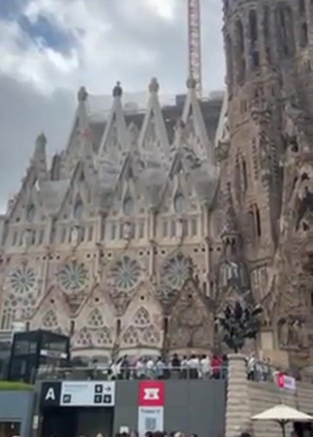 n exterior view of the Sagrada Familia in Barcelona, Spain. The camera slowly tilts upwards, showcasing the intricate façade of the basilica, the tall spires, and a construction crane in the background. A crowd of people is visible in the foreground, some taking photos, near the entrance of a building identified by a large "A" and a sign for "Tickets." The sky is overcast with patches of blue.