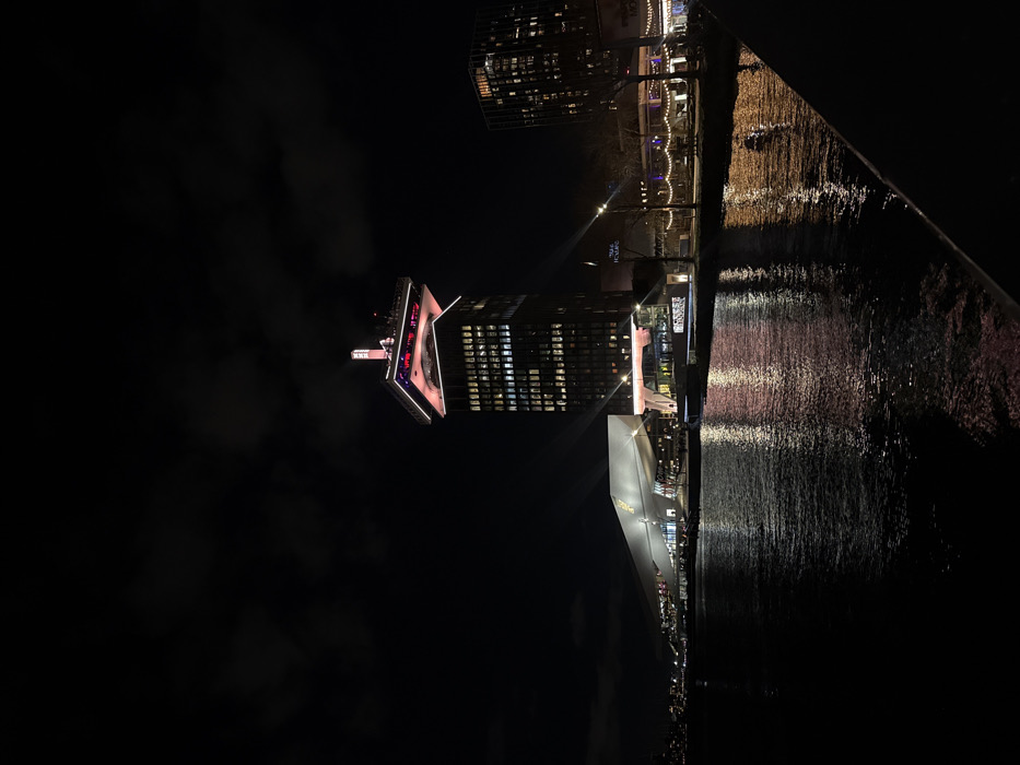 Illuminated buildings and waterfront structures reflect in a dark body of water at night. A tall building with a distinct observation deck stands out, showcasing a colorful display. Other buildings line the waterfront, their lights adding to the urban nightscape. The water reflects the lights, creating shimmering patterns. The sky is dark, emphasizing the brilliance of the city lights.