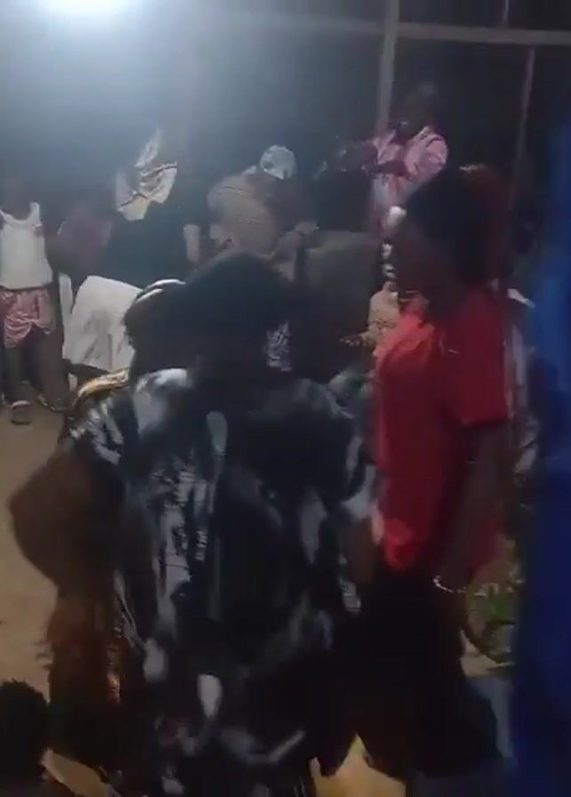 A group of people are dancing and socializing in a brightly lit outdoor area at night. Several individuals are dancing to the music, while others stand around watching or talking. The scene appears to be a celebration or gathering. The setting is somewhat simple, with the lighting highlighting the immediate area around the group. There are no clear details of specific clothing styles or facial expressions due to the quality of the video.