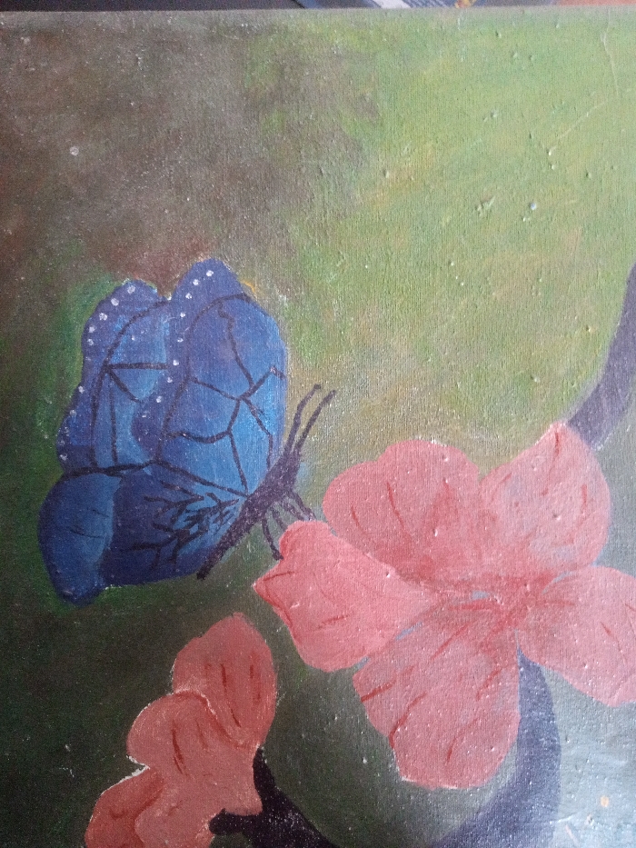 This image is a photograph of an acrylic or oil painting on a textured canvas. The painting depicts a blue butterfly with prominent black vein lines and white speckles on its wings. The butterfly's body is dark blue, and it has black antennae. It is positioned on a cluster of pink flowers with simplified petal structures. One large flower occupies the center-right of the frame, with smaller, partially visible pink blossoms below it. A dark, thick stem or branch is partially visible in the lower right, supporting the flowers. The background transitions from a darker, mottled greenish-brown in the upper left to a lighter, mottled green in the upper right, suggestive of foliage or an outdoor setting. The artwork does not depict a discernible or identifiable real-world location within the city of Jos, Nigeria; it portrays a generalized natural scene.
