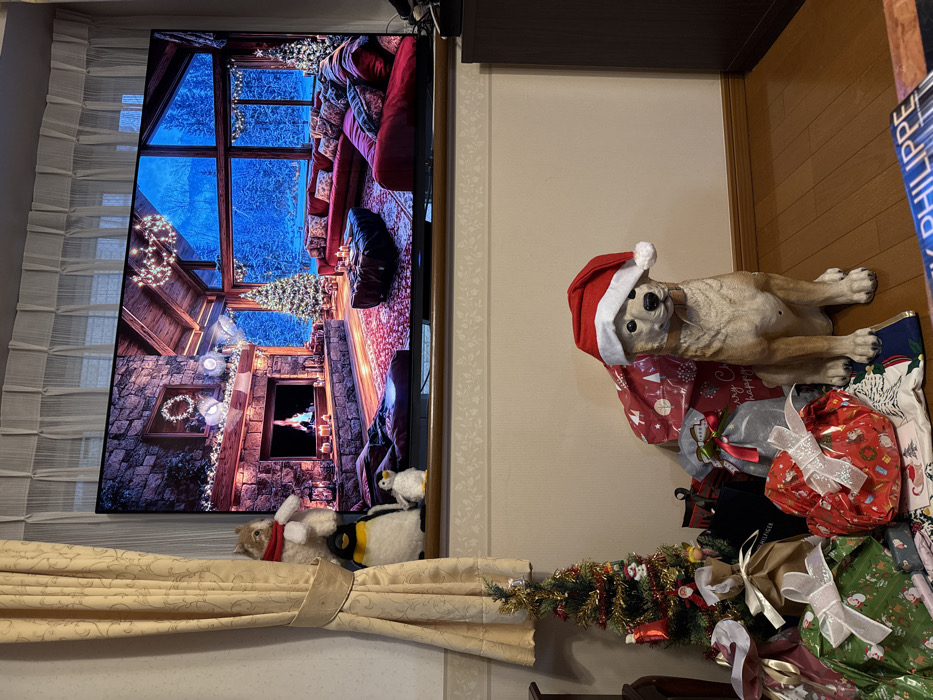 A dog statue with a Santa hat lies atop wrapped Christmas gifts near a wall. A small decorated Christmas tree is adjacent. A large television screen displays a cozy cabin scene with a Christmas tree and snow-covered landscape outside. Window curtains and stuffed animal decorations are partially visible next to the TV. The scene suggests a holiday atmosphere.