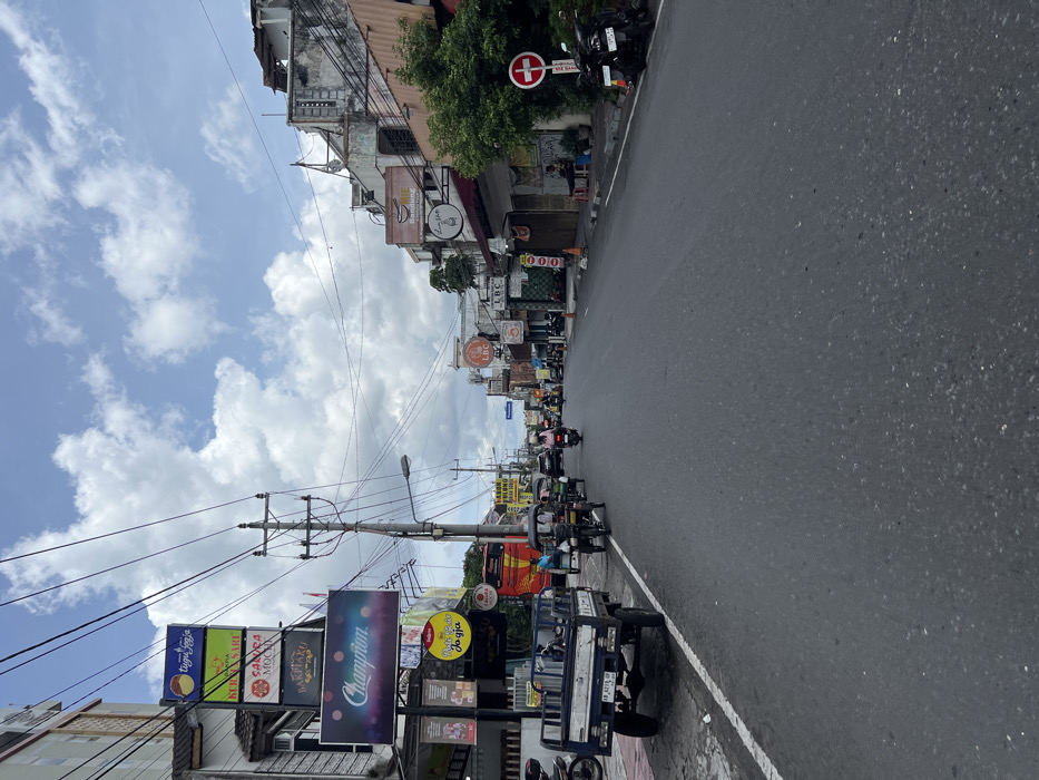 A tilted street view showcases a busy road with motorbikes and vehicles. Buildings line the left side, displaying multiple signs like "Champion" and "Tagijoja". Overhead wires crisscross the sky, partially obscured by clouds. A red-and-white sign is visible further down the street, with more storefronts and activity visible in the distance. The road itself takes up the majority of the right side.