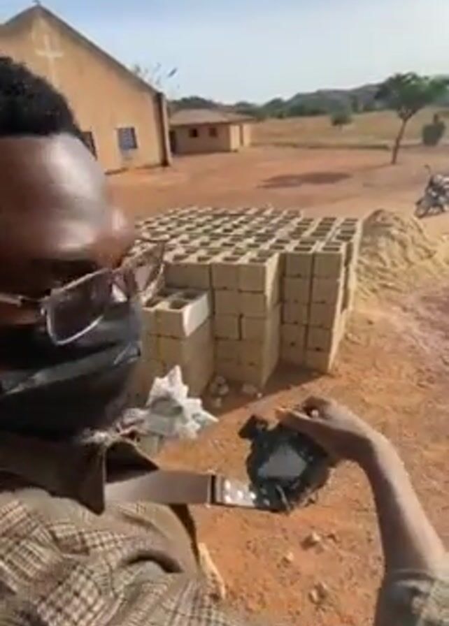 The video depicts a person wearing sunglasses and a black face mask, holding a camera and walking around a church in a rural area. The church is a simple, one-story building with a cross on top and blue doors and windows. In front of the church is a large pile of cinder blocks, and in the background, there is a sparse landscape with some trees and hills. The person seems to be taking photos or videos of the church and the surrounding area. The ground is reddish-brown, indicating a dry, possibly arid climate.